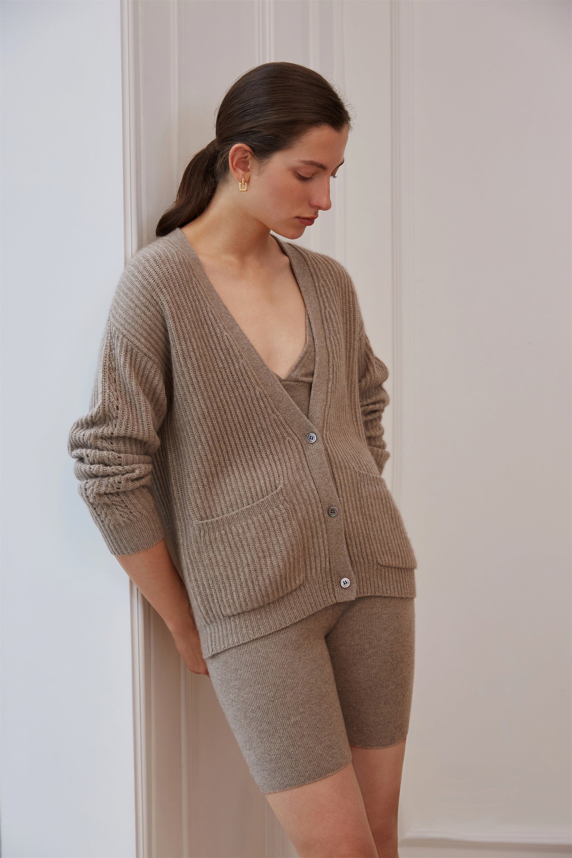 Classic with a modern appeal, the BLAIR Fisherman Cardigan is crafted using 100% pure cashmere for a luxuriously soft feel. This contemporary sweater features bold fisherman knit with a plunging v-neckline. Pair with the ANGELA Bandeau and BROOKE Biking Pants for the ultimate cozy look.