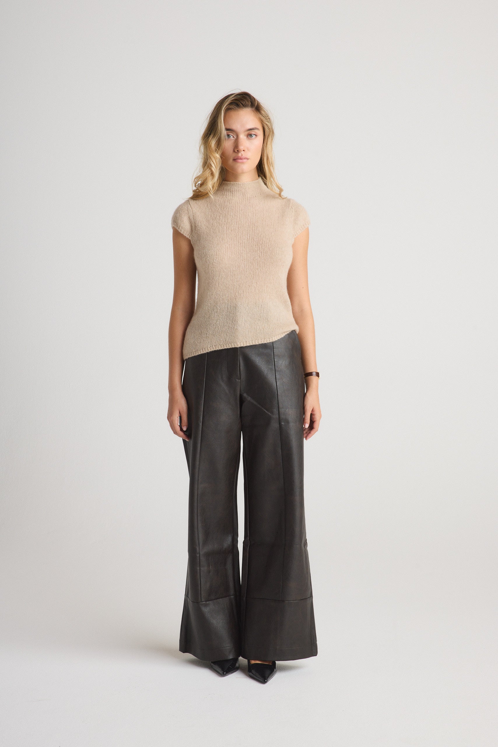 Sophisticated and chic, this striking short sleeves sweater is the perfect statement piece to add to your year-round wardrobe. This piece features a flattering mock neck with cap sleeves and subtle ribbed detailing for a contemporary elegance that you can wear anywhere. It's ageless, timeless, seasonless.