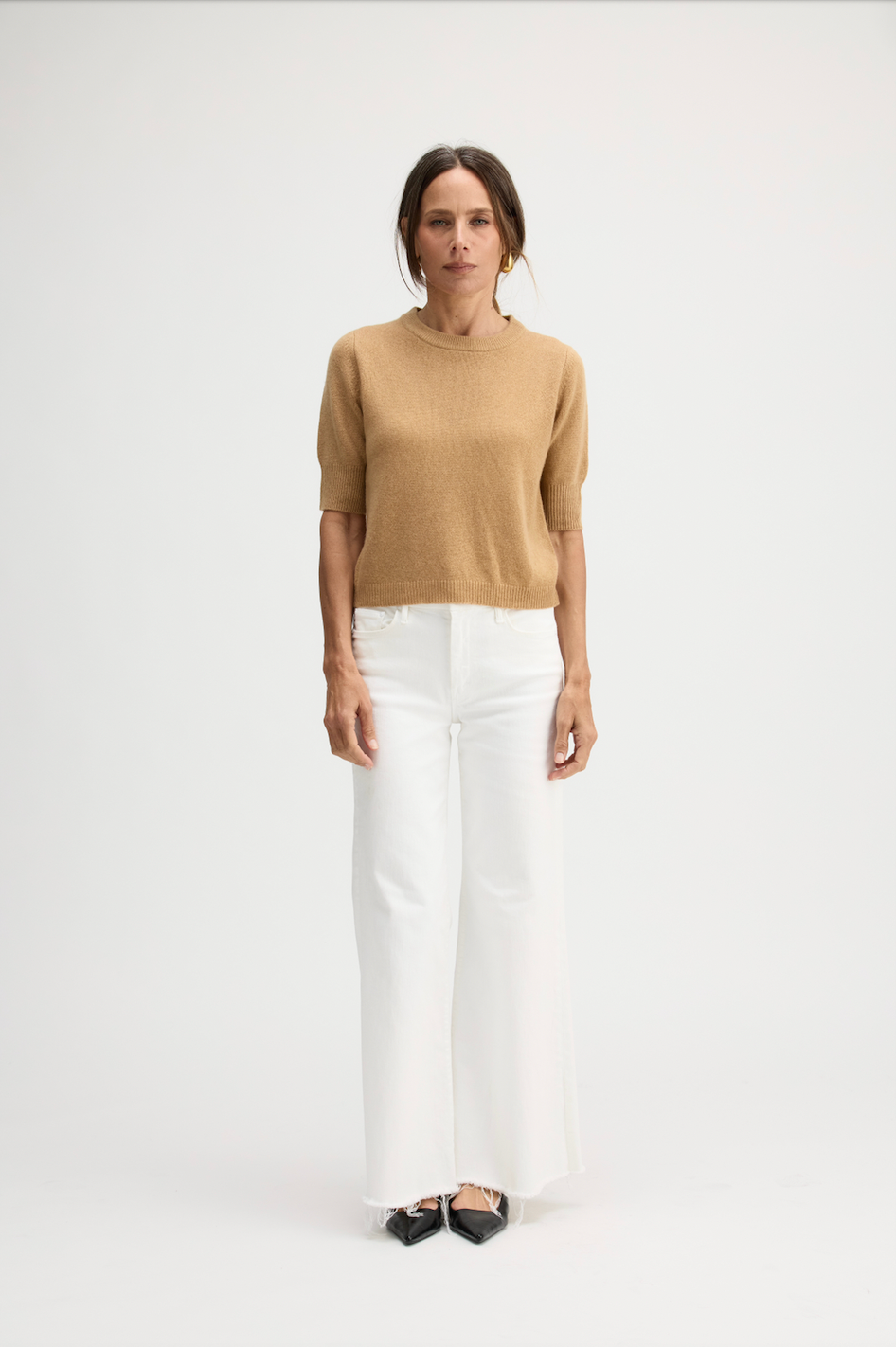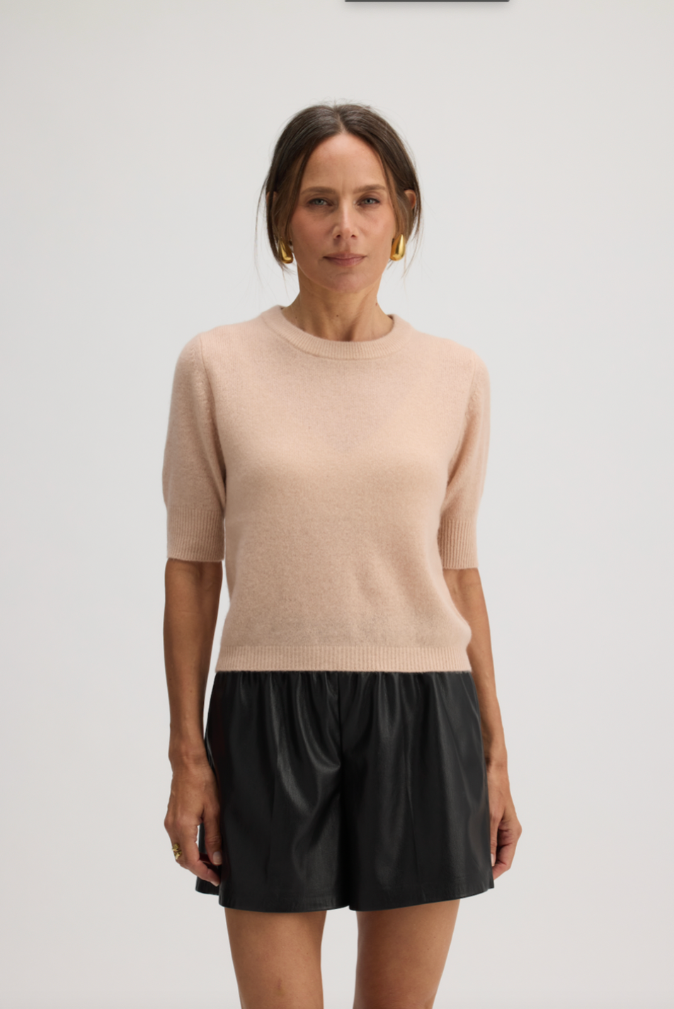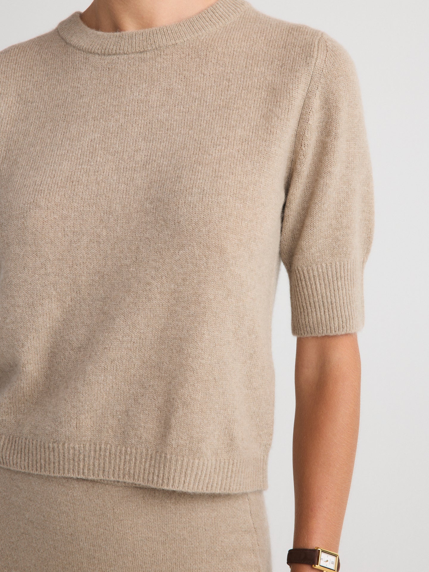 A short-sleeve top in 100% cashmere with a refined, close-knit finish and a naturally breathable feel. Ideal for wearing solo in warmer months or layered under jackets in cooler weather.