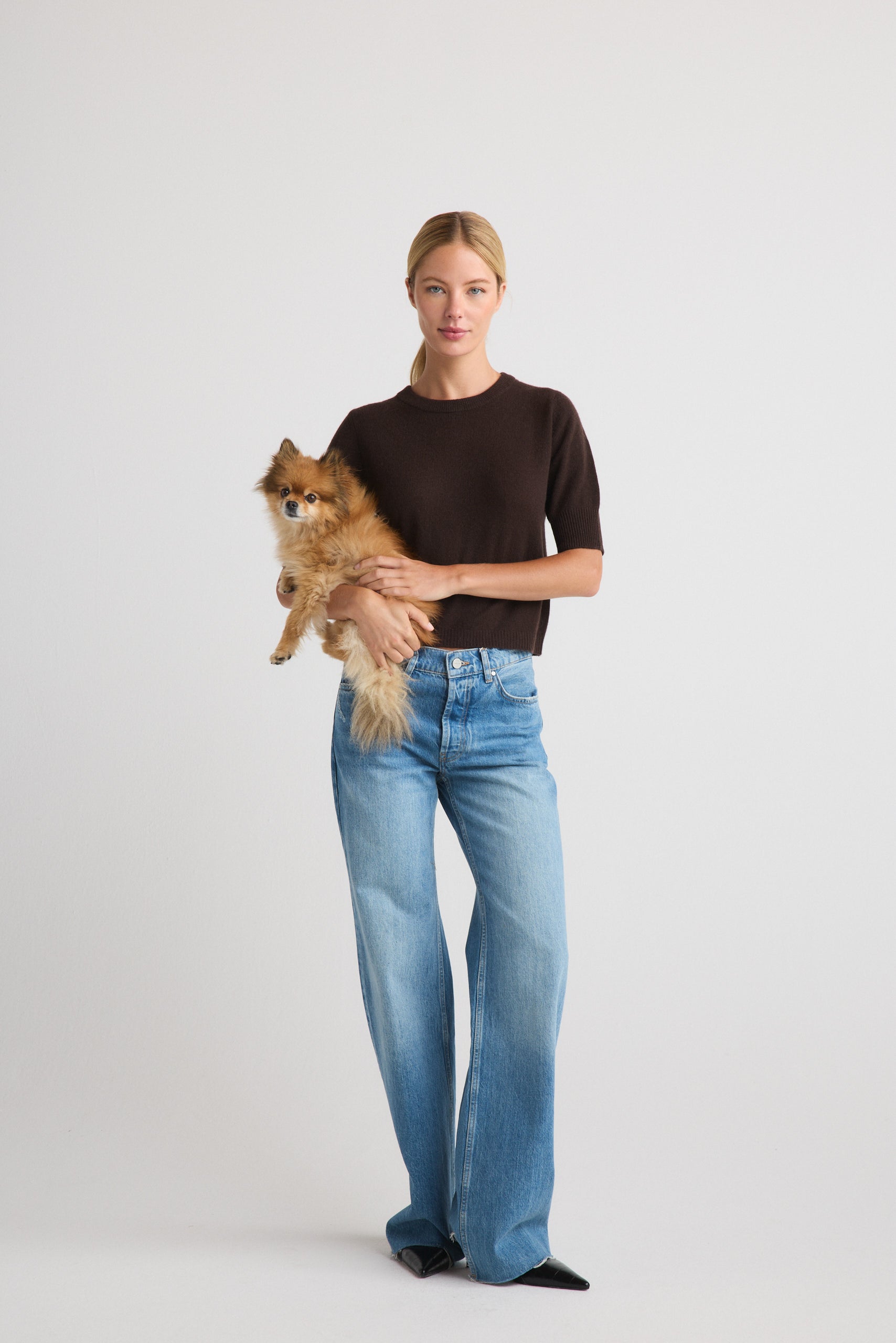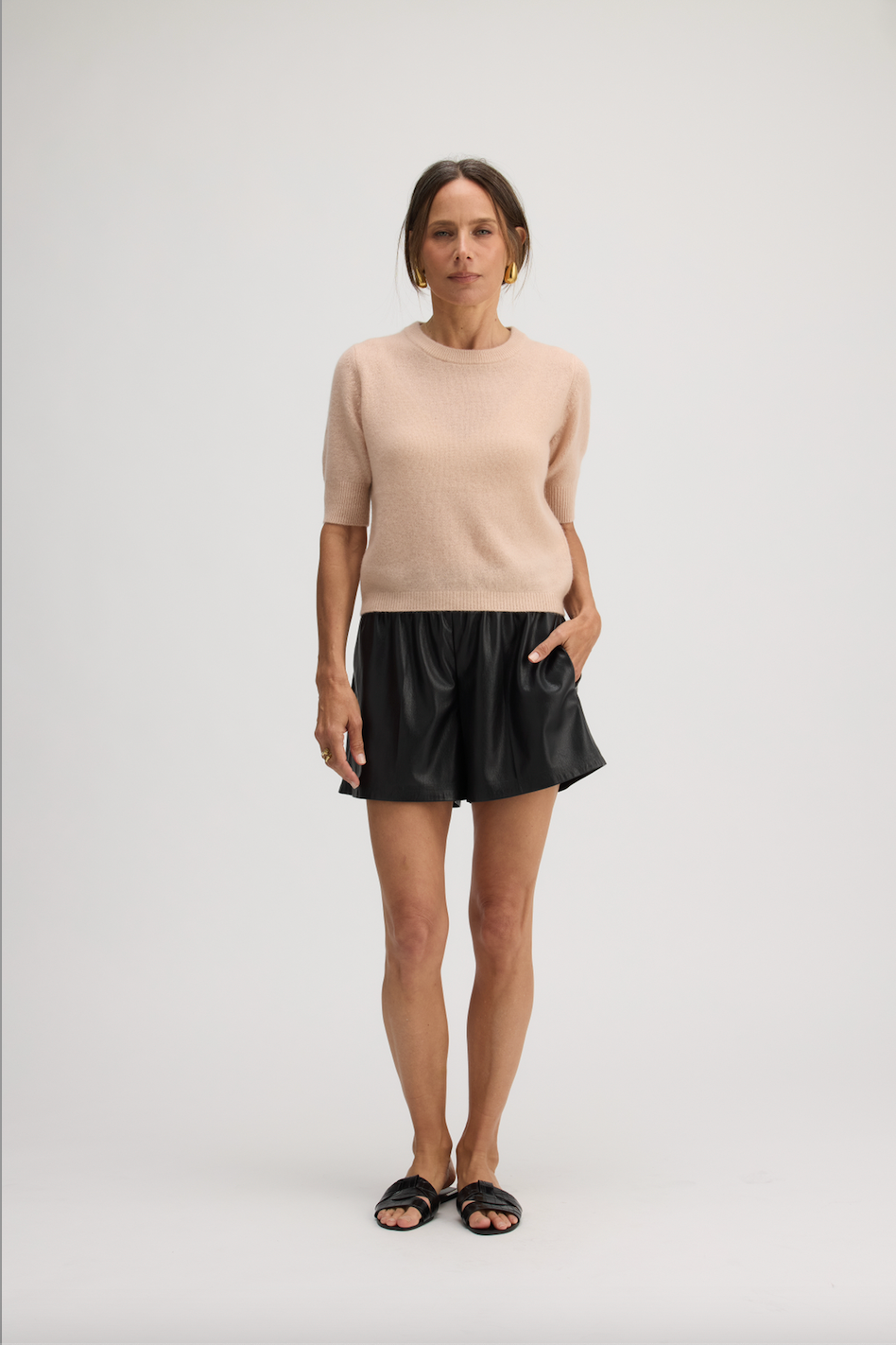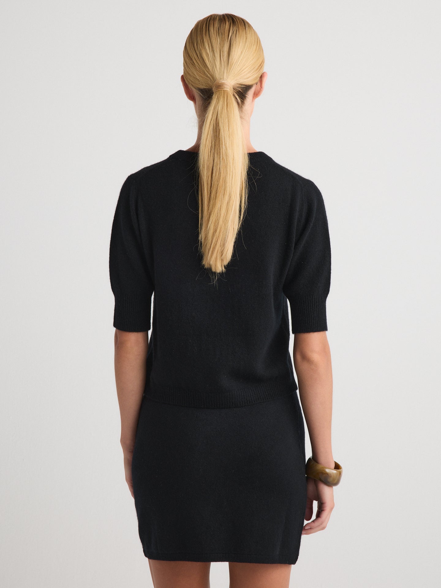 A short-sleeve top in 100% cashmere with a refined, close-knit finish and a naturally breathable feel. Ideal for wearing solo in warmer months or layered under jackets in cooler weather.