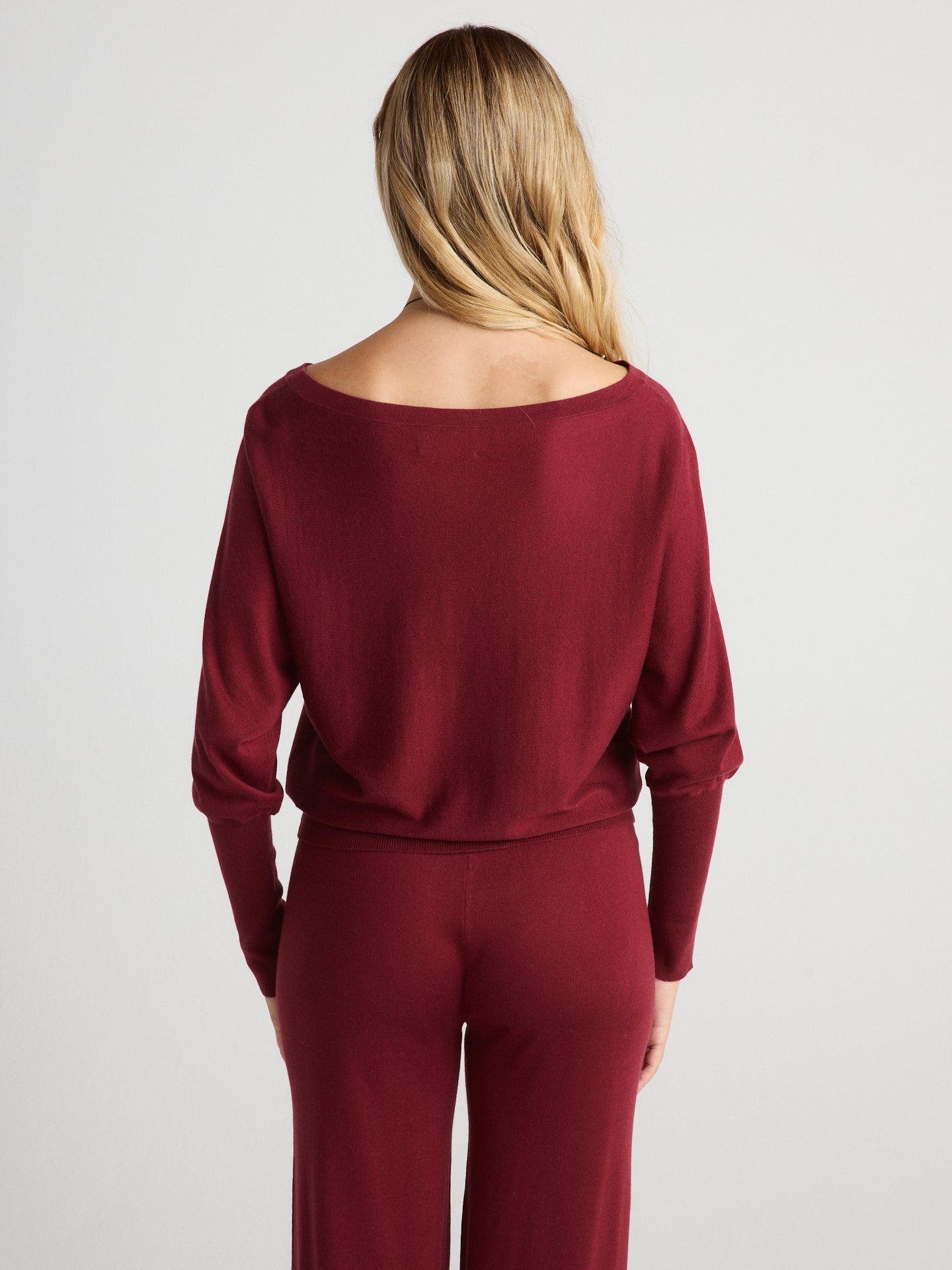 An off-the-shoulder silhouette in fine silk-cashmere with softly cinched sleeves that create a gentle blouson effect. Lightweight and flattering from every angle.