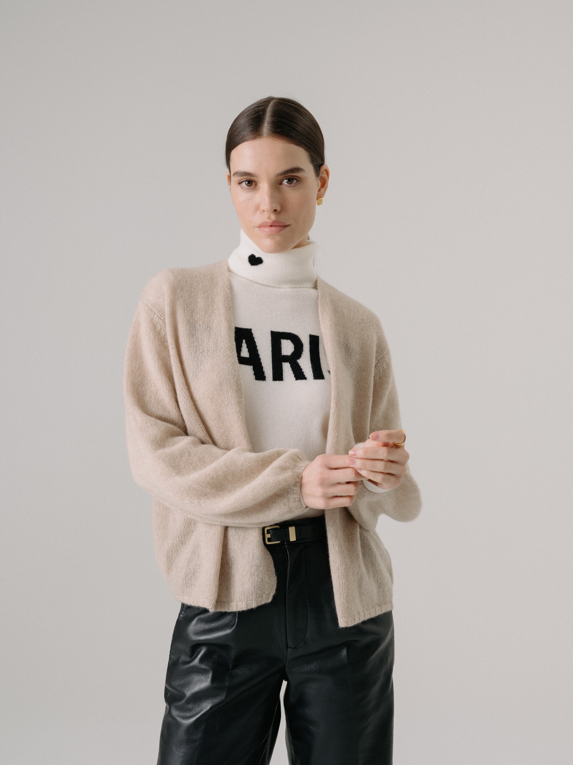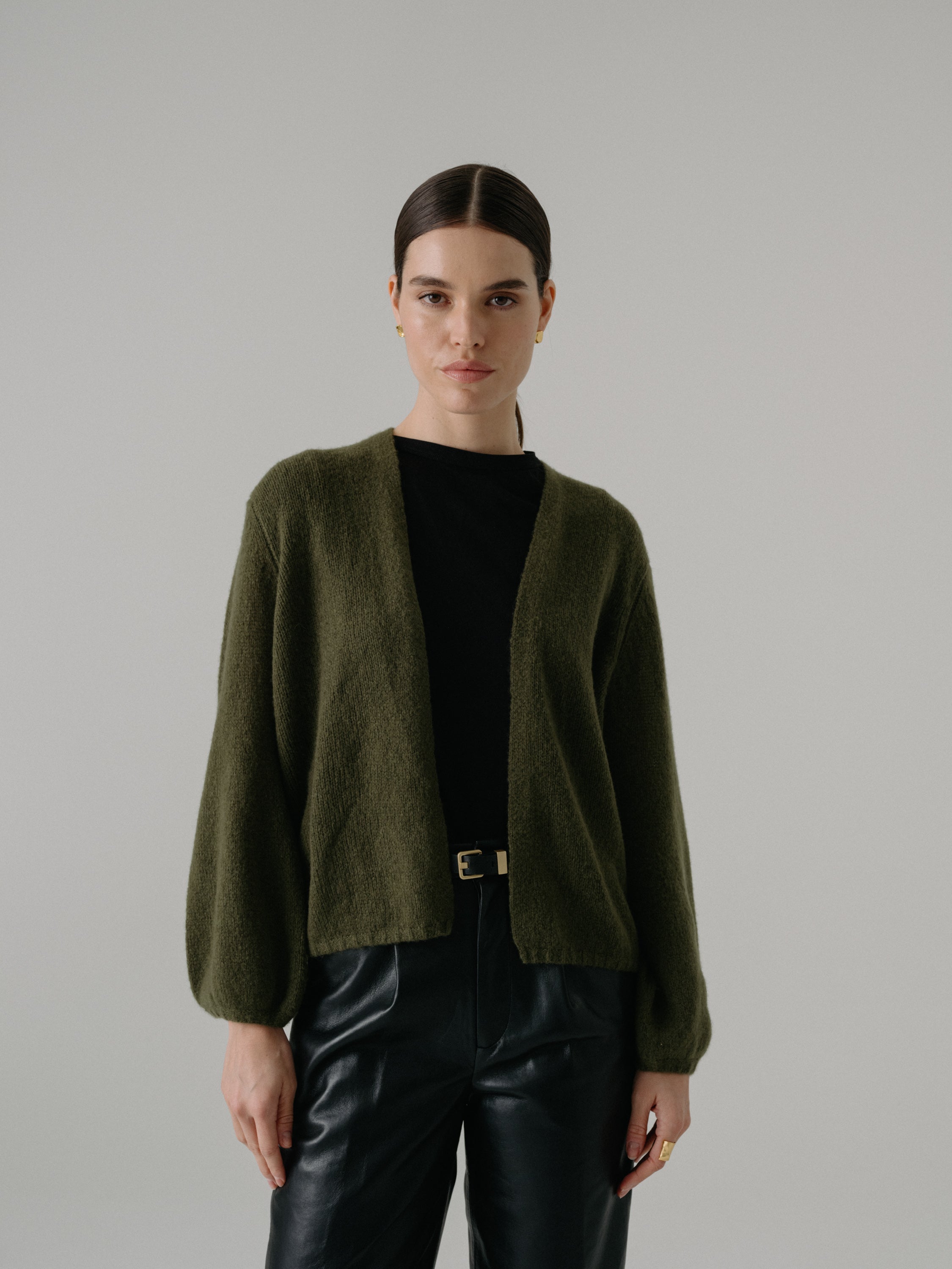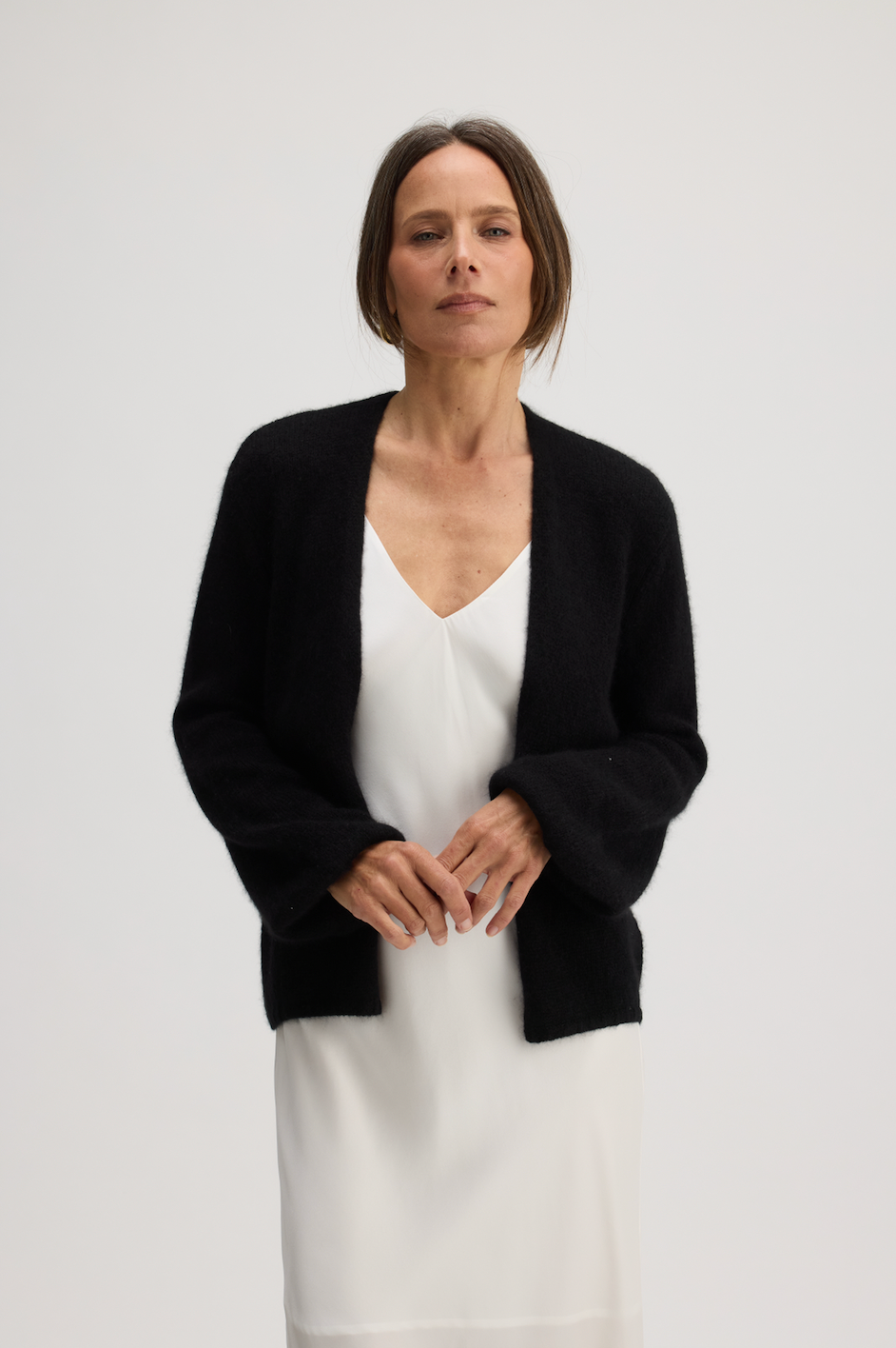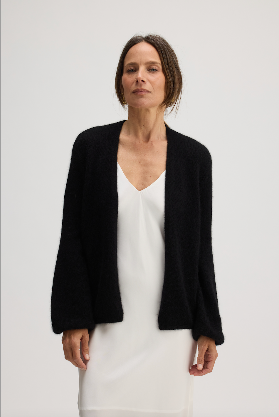 An open-front cardigan in silk-cashmere with voluminous balloon sleeves. Relaxed in fit with a breathable, cloud-soft texture—ideal for layering through shifting seasons.