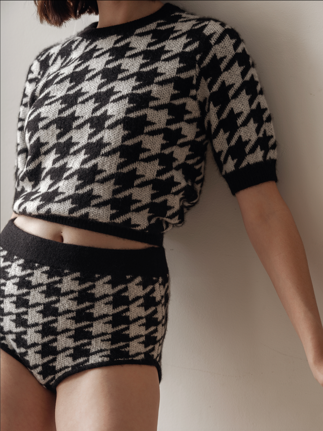 Elevate your wardrobe with our luxurious short sleeve houndstooth cashmere top. This chic piece features a timeless houndstooth pattern in striking black and ivory, offering a perfect blend of classic and contemporary style. Soft, lightweight, and incredibly comfortable, it's ideal for any occasion, whether you're dressing up for a night out or adding a touch of elegance to your everyday look. Pair it with our matching JORNI shorts for a complete look.