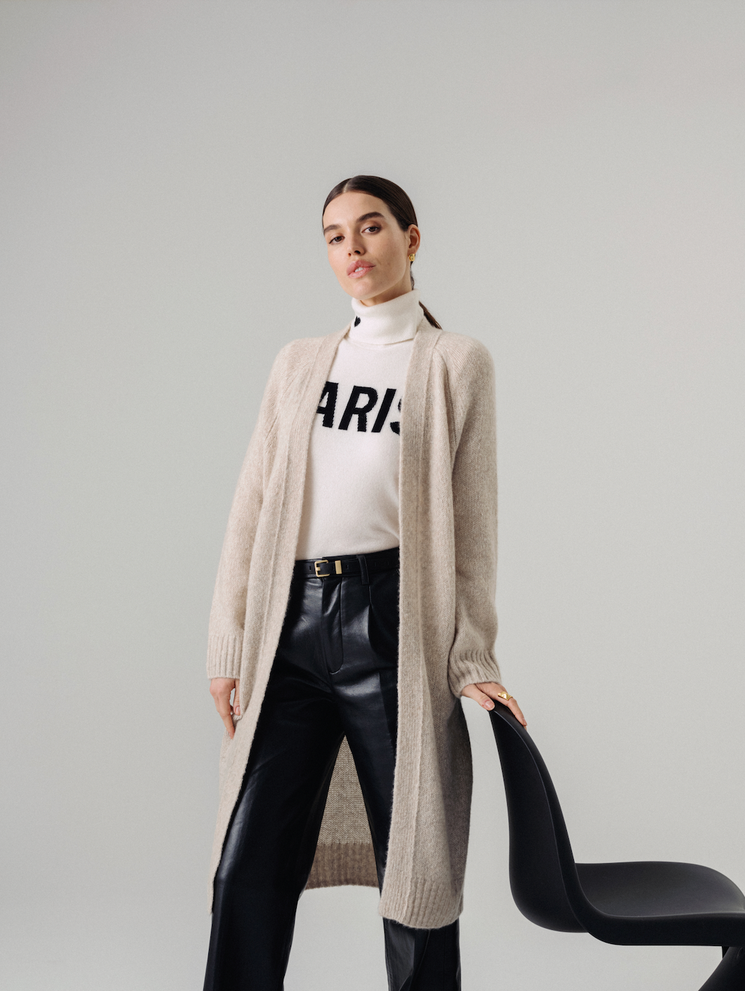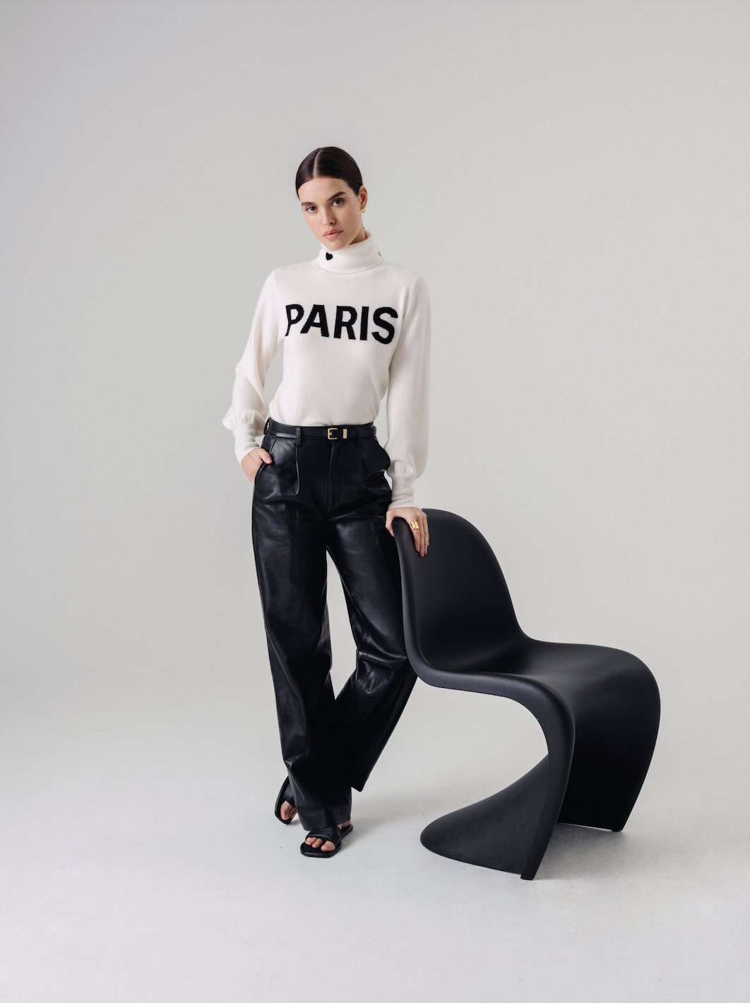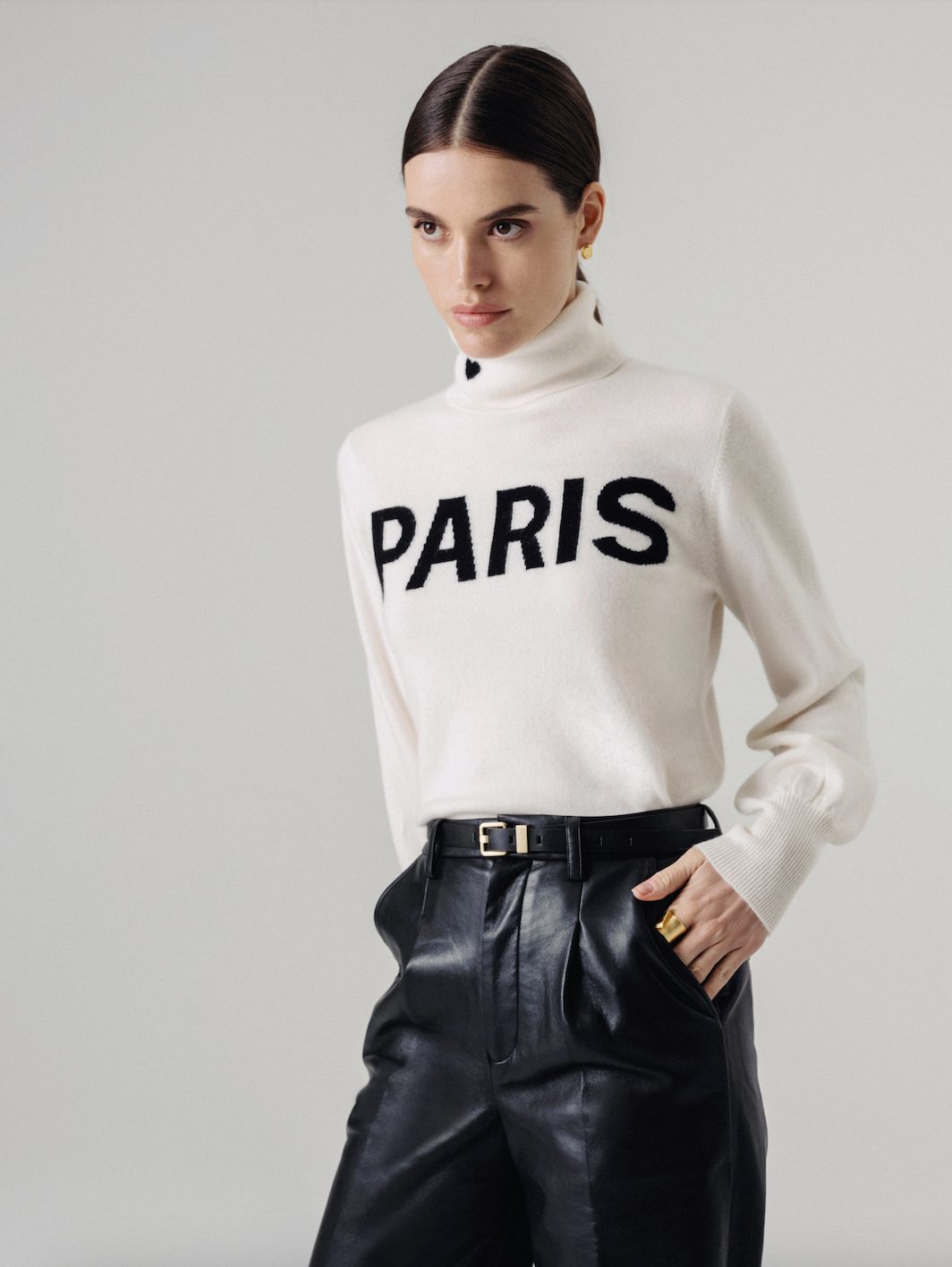 The Paris cashmere turtleneck sweater is a bold accent to any outfit, exuding elegance and style. Featuring balloon sleeves and a black heart on the neckline of the ivory fabric, it creates a striking contrast that embodies timeless sophistication. Crafted from the finest cashmere, this sweater is perfect for the fall and winter seasons, offering both warmth and luxury. The Paris cashmere turtleneck sweater is an essential piece for anyone looking to make a stylish statement this season.